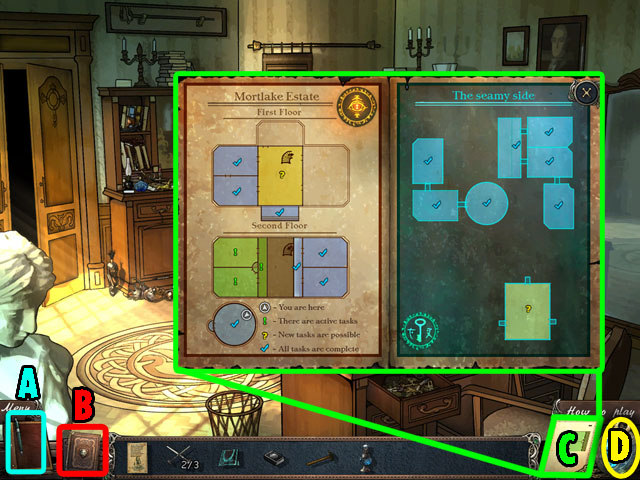 ในรูป ห้องที่มีเครื่องหมายตกใจสีเขียวขึ้นอยู่ เป็นห้องที่เราต้องทำภารกิจให้เสร็จก่อน